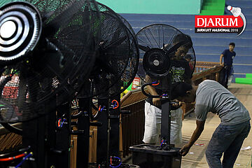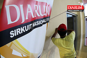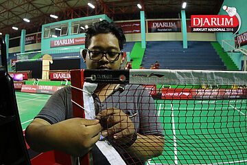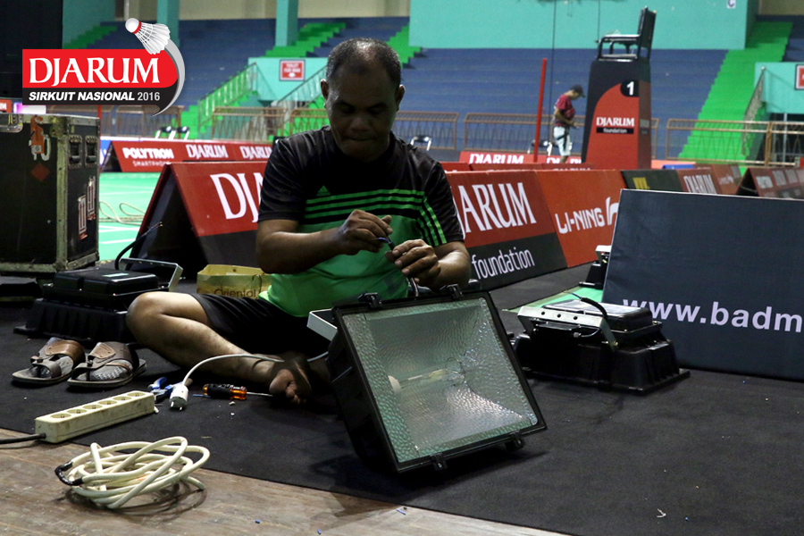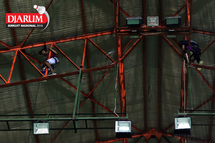 Seorang pekerja mempersiapkan dekorasi Djarum Sirkuit Nasional Li-Ning Jawa Barat Open 2016