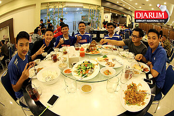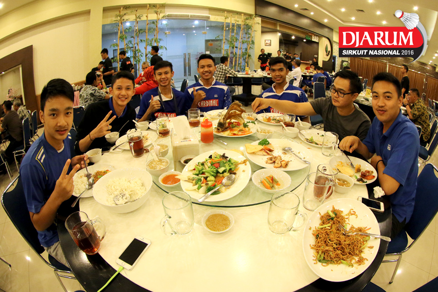 Sejumlah pebulutangkis tunggal putra Mutiara Cardinal saat santap jamuan Welcome Dinner