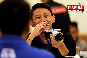 Ekspresi A. K. Zailani dengan kameranya saat acara Welcome Dinner