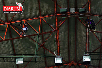 Dua pemanjat saat memasang instalasi lampu pertandingan