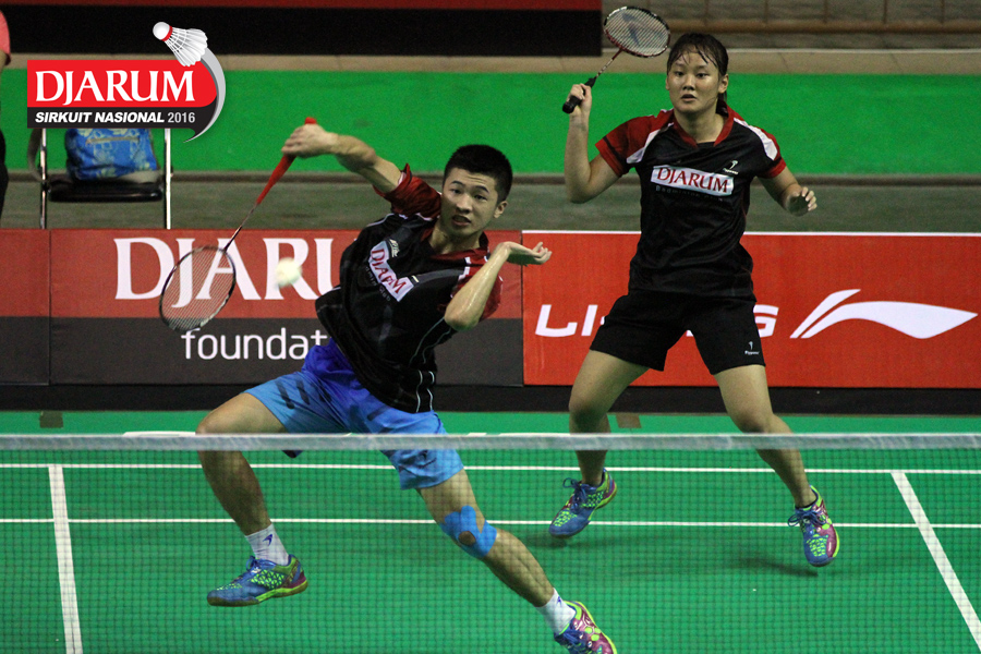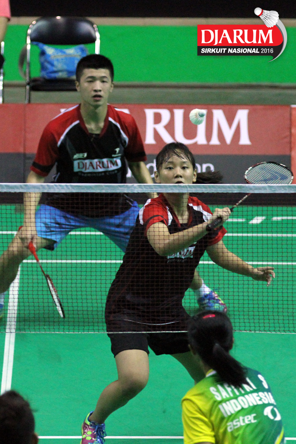 Forverio Rivaldo/Agatha Imanuela (Djarum Kudus) bersiap menyambar pengembalian tanggung