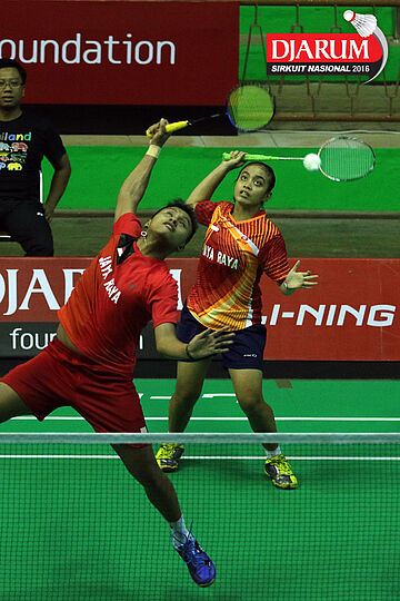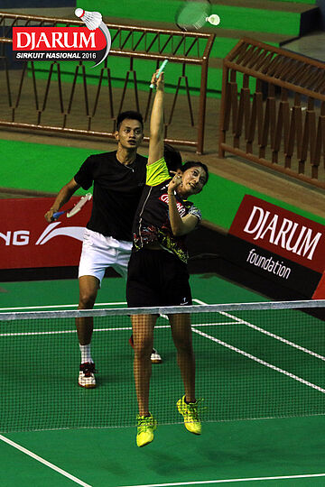 Nugroho Andi/Gebby Ristiyani (Halim/Mutiara Cardinal) menyambar pengembalian tanggung