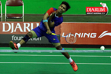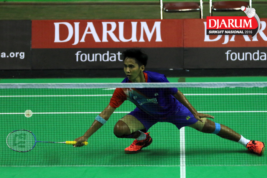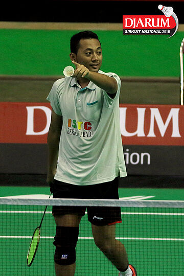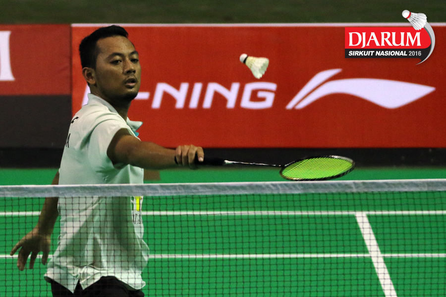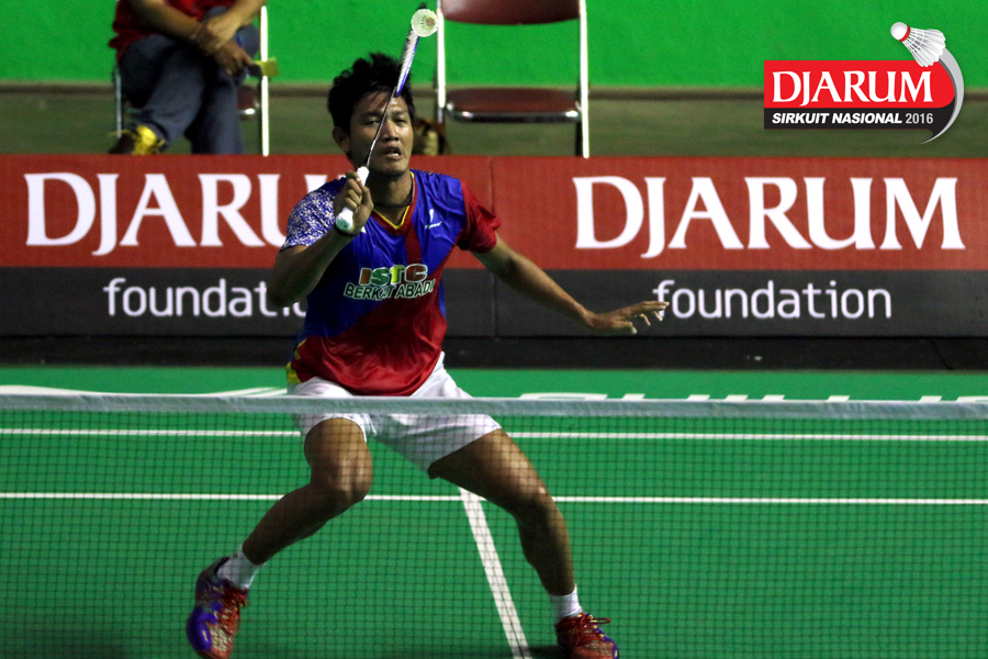Arahmad Kurniawan (SGS PLN) mengembalikan shuttlecock