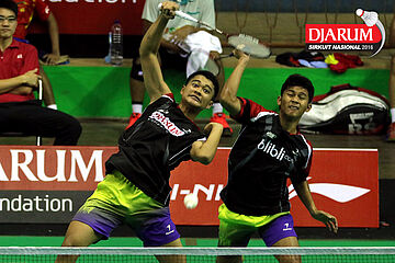 Ardy Nugroho/Ario Bimo (Djarum Kudus) melepaskan serangan