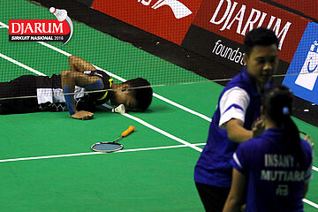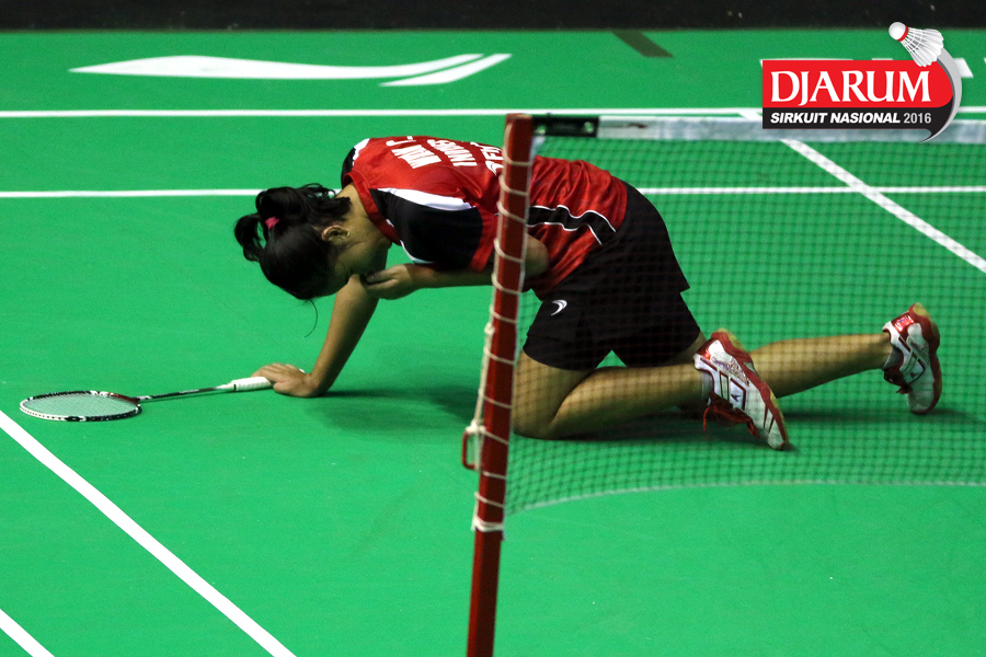 Wulan Cahya (Djarum Kudus) terjatuh saat berusaha menghadang serangan