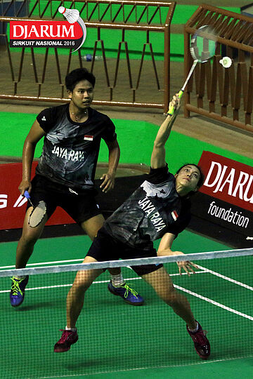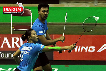 Irfan Fadhillah/Weni Anggraeni (Jaya Raya) bersiap melepaskan serangan