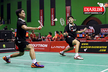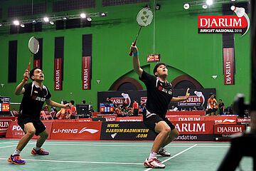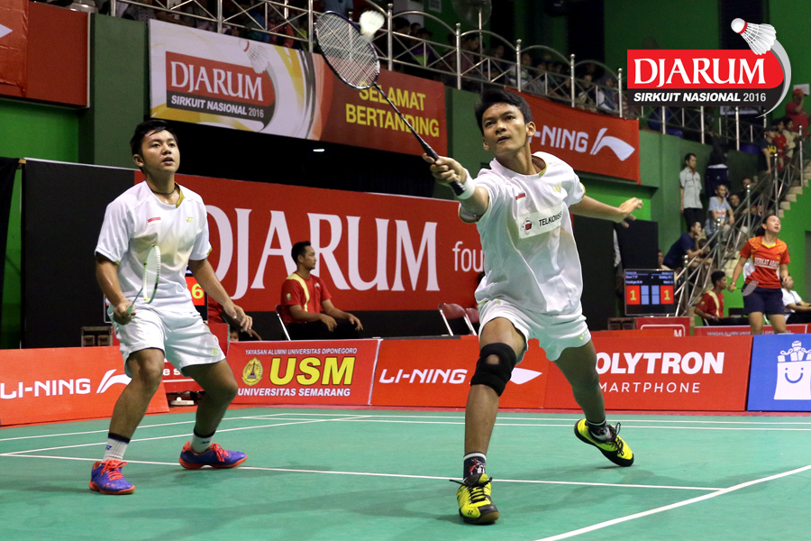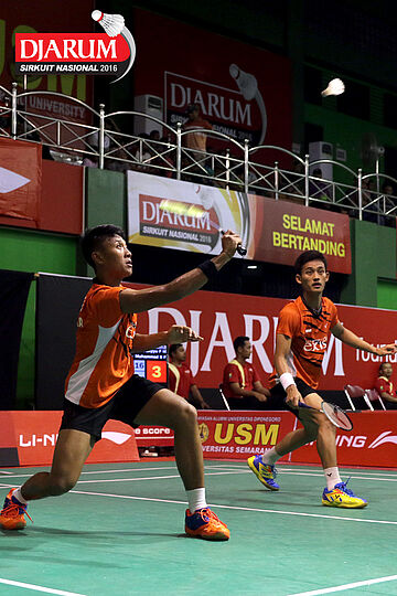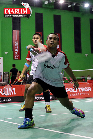 Adnan Maulana/Reza Dwicahya (Jaya Raya) Mengembalikan Shuttlecock.