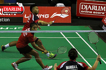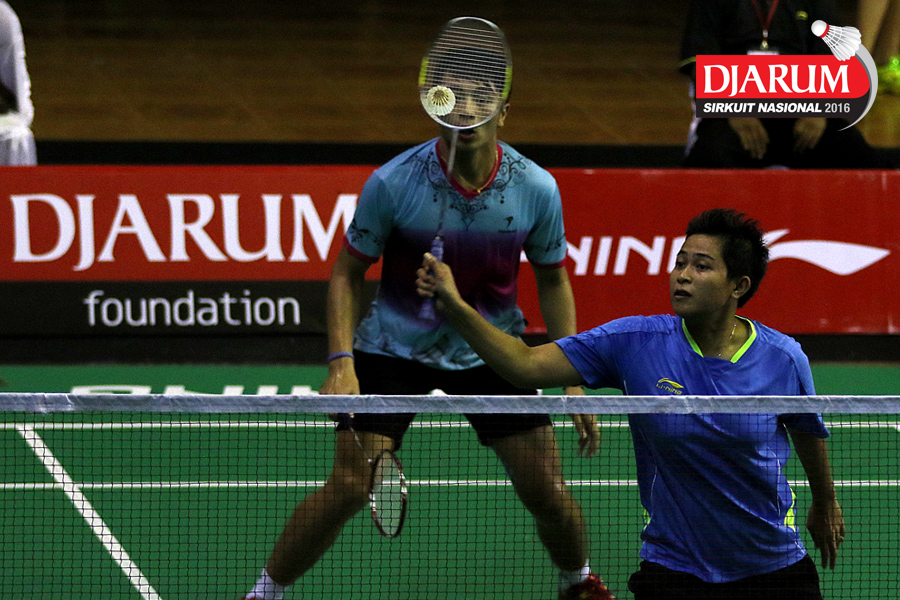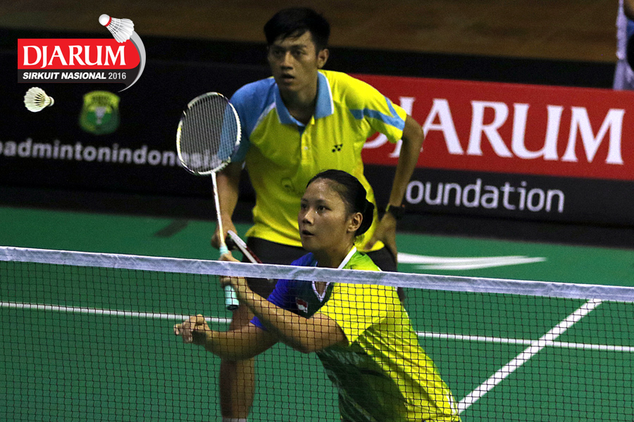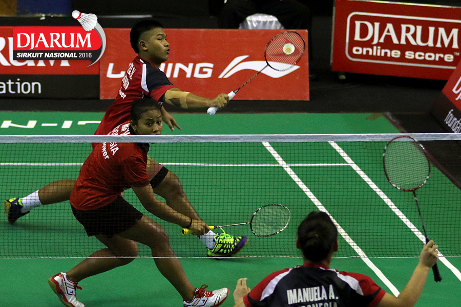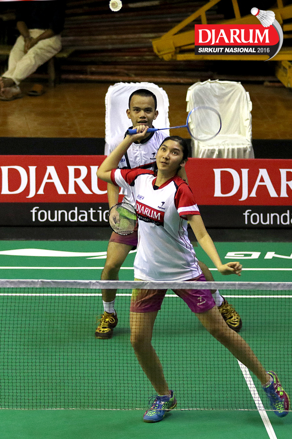 Rian Cana Varo/Shelandry Vyola (Djarum Kudus) bersiap menyambar pengembalian tanggung