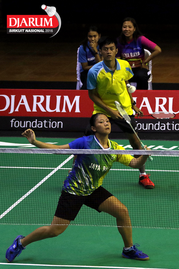Billy Jonathan/Brigita Marcelia (CWIBC/Jaya Raya) mengembalikan shuttlecock