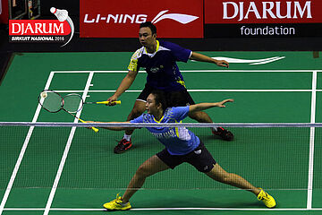 Afiat Yuris/Nadya Melati (Pertamina Fastron) bersiap menghadang serangan