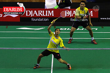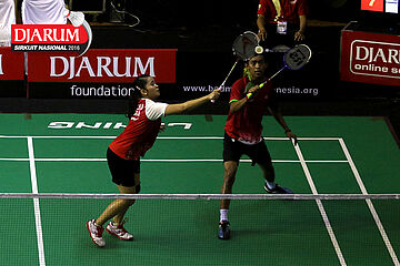 Rehan Naufal/Siti Fadia (Djarum Kudus) mengembalikan shuttlecock