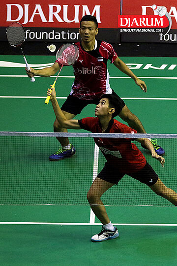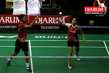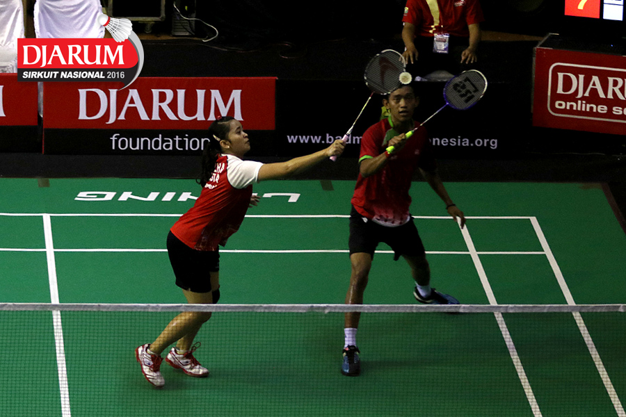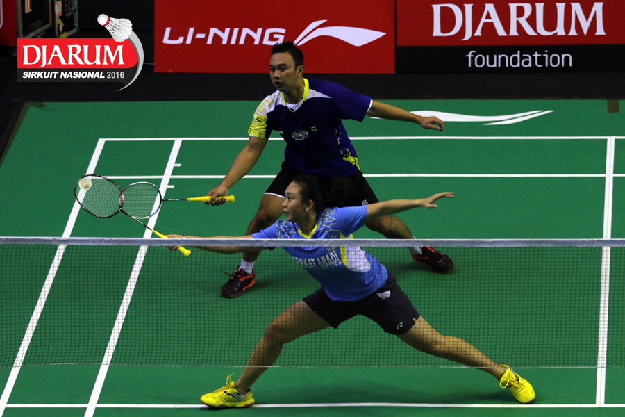 Trikusuma Wardhana/Keshya Nurvita Hanadia (Exist/Berkat Abadi) bersiap menyambar pengembalian tanggung