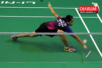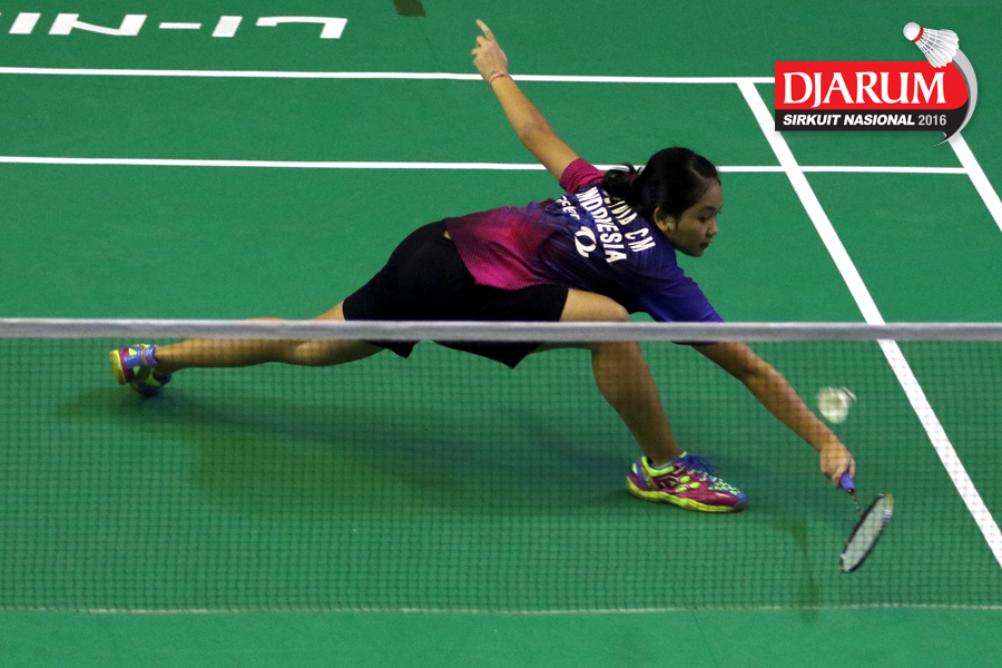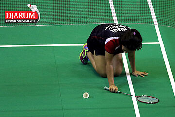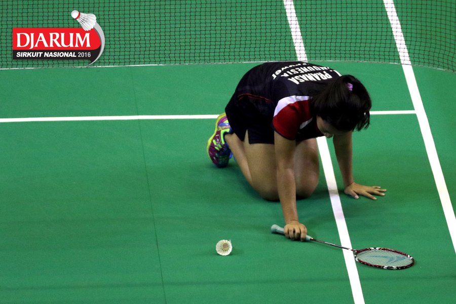 Vanadia Pranasa (Djarum Kudus) terjatuh saat berusaha mengembalikan shuttlecock