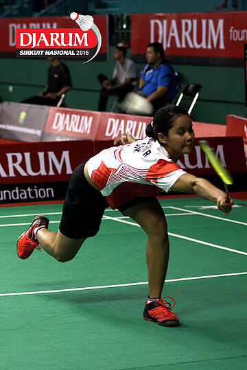 Erlina Kurniati (Jaya Raya) berusaha menggapai shuttlecock.