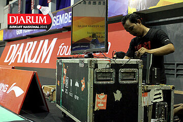 Seoarang pekerja saat memasang perlengkapan dekorasi Djarum Sirkuit Nasional Li-Ning NTB Open 2015