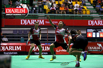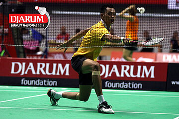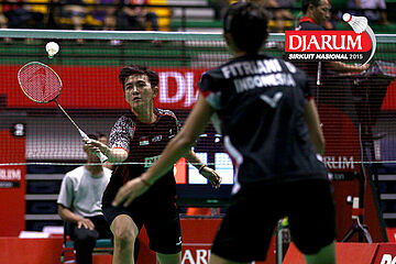 Nugroho Andi (JR Enkei) mengembalikan shuttlecock.