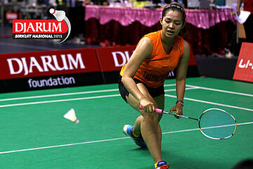 Aprillia Yuswandari (Semen Gresik) mengembalikan shuttlecock.