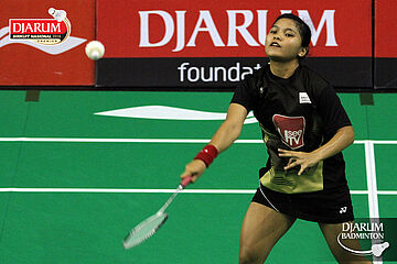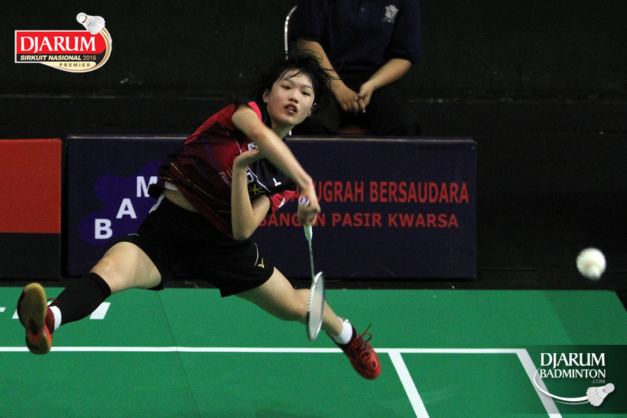 Defany Ifadh (Pusdiklat Telkom Bandung) mengembalikan shuttlecock