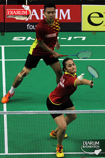 Rehan Naufal/Siti Fadia (Djarum Kudus) mengembalikan shuttlecock
