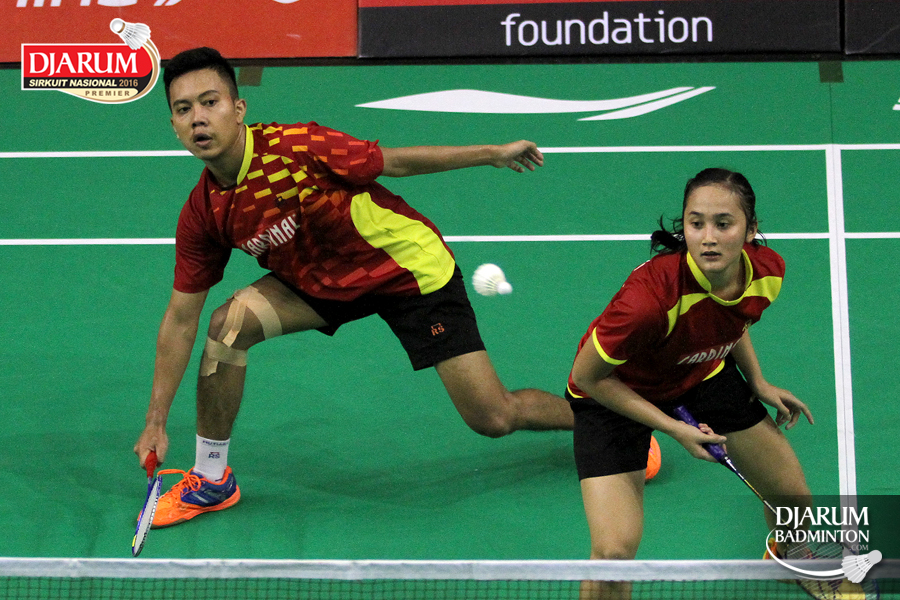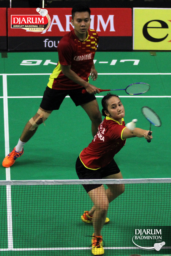 Alfandy Rizki/Phita Haningtyas (Jaya Raya) mengembalikan shuttlecock