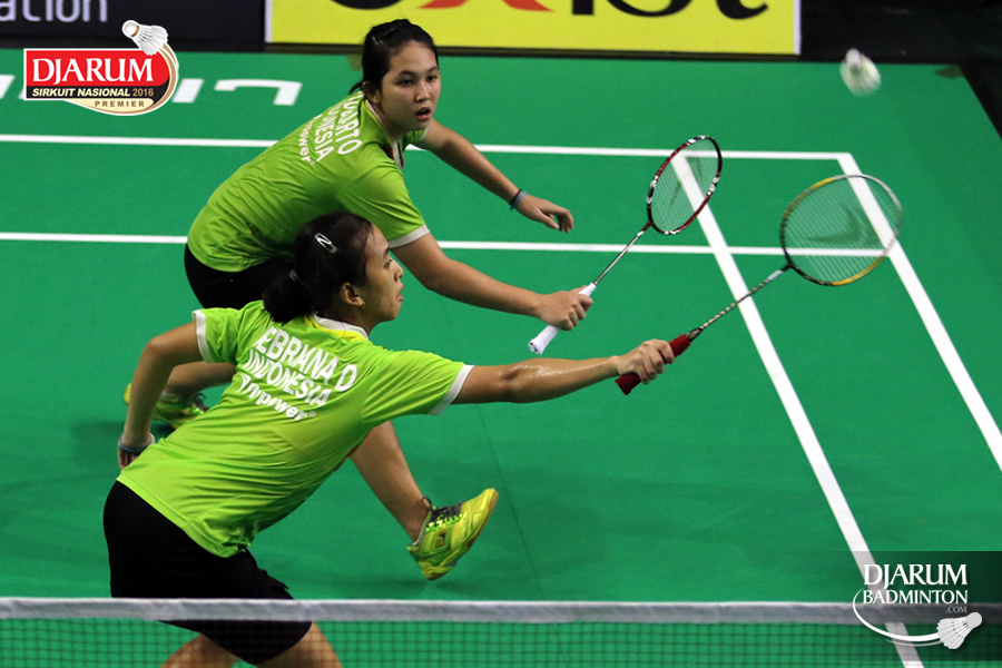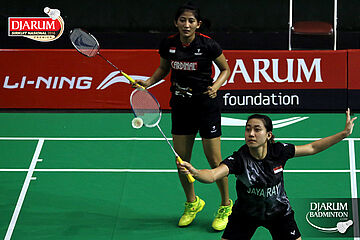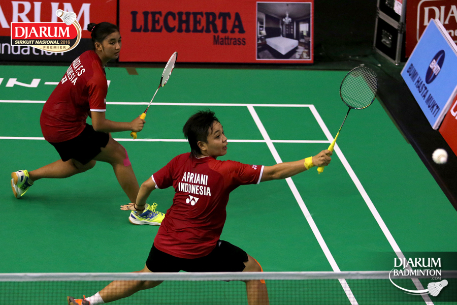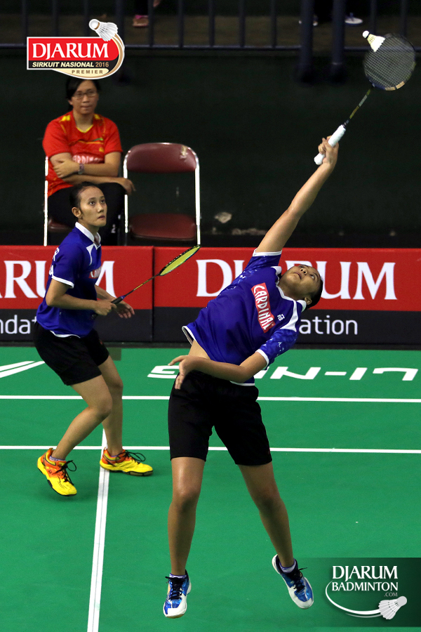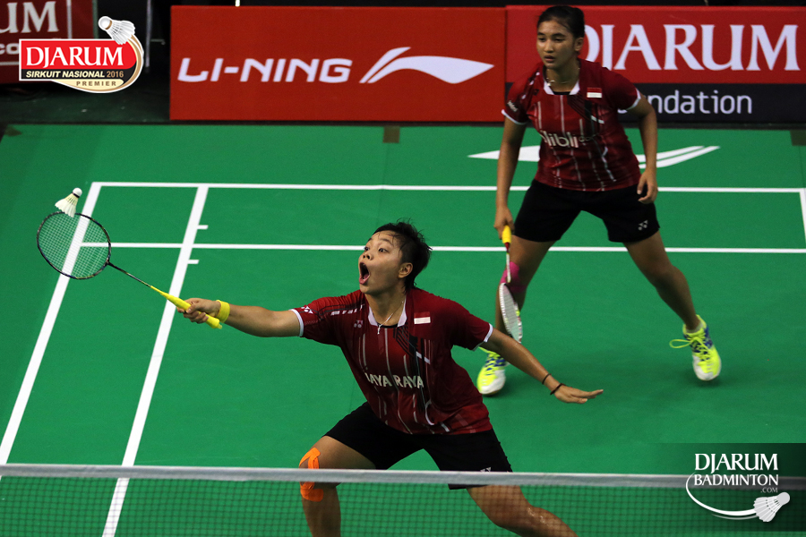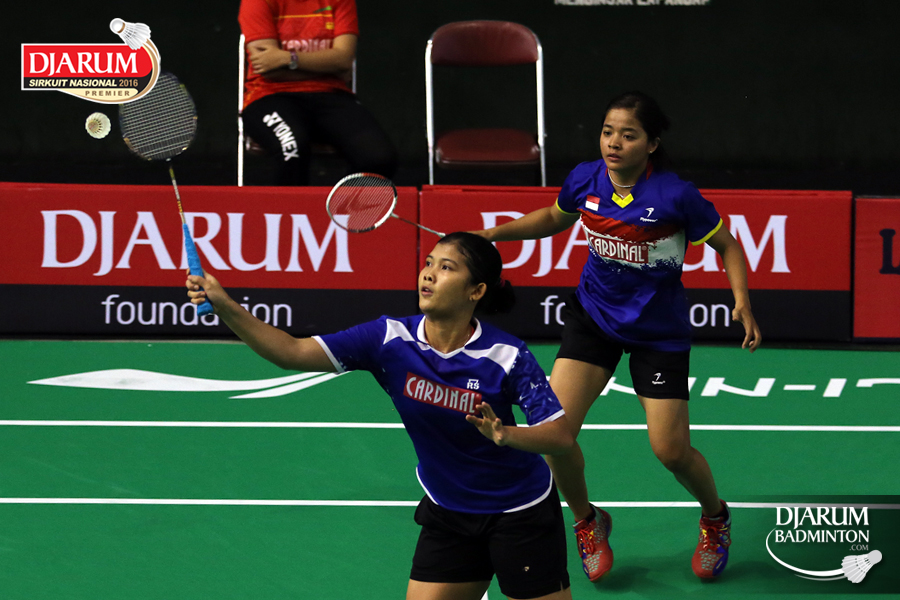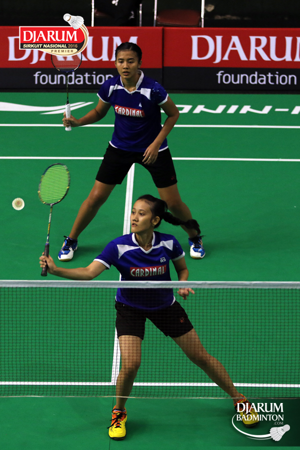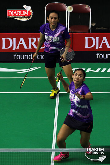 Gebby Ristiyani/Weni Anggraeni (Mutiara Cardinal/Jaya Raya) bersiap menyambut pengembalian