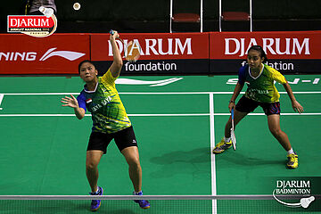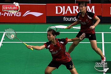 Febriana Dwipuji/Ribka Sugiarto (Djarum Kudus) menghadang serangan