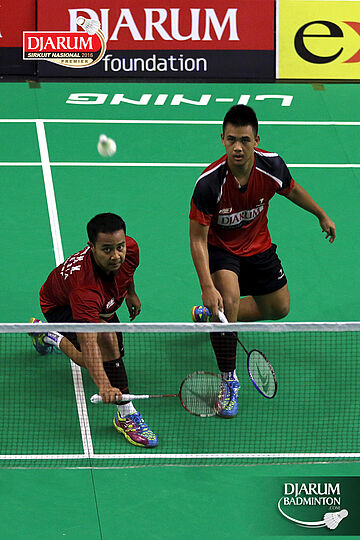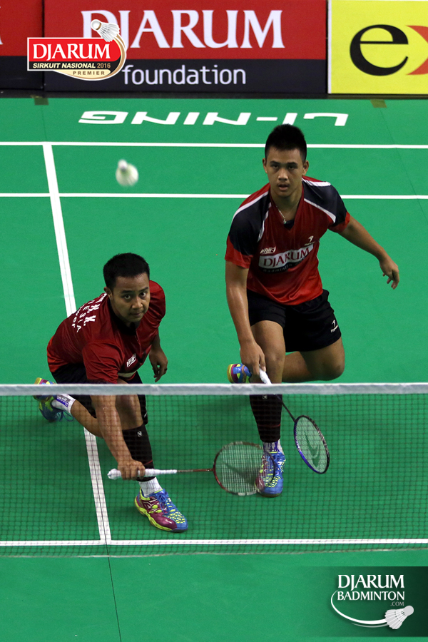 Helmi Abbu/Rehan Naufal (Djarum Kudus) menghadang serangan