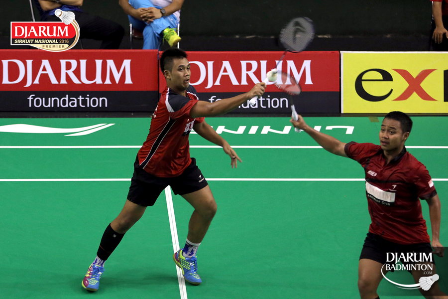 Helmi Abbu/Rehan Naufal (Djarum Kudus) mengembalikan shuttlecock