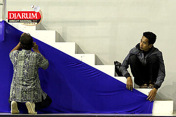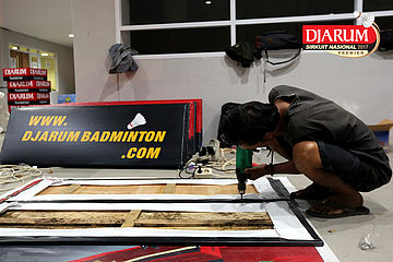 Salah Satu Pekerja Sedang Mempersiapkan Atribut Djarum Sirkuit Nasional Li-ning Premier Jawa Barat Open 2017