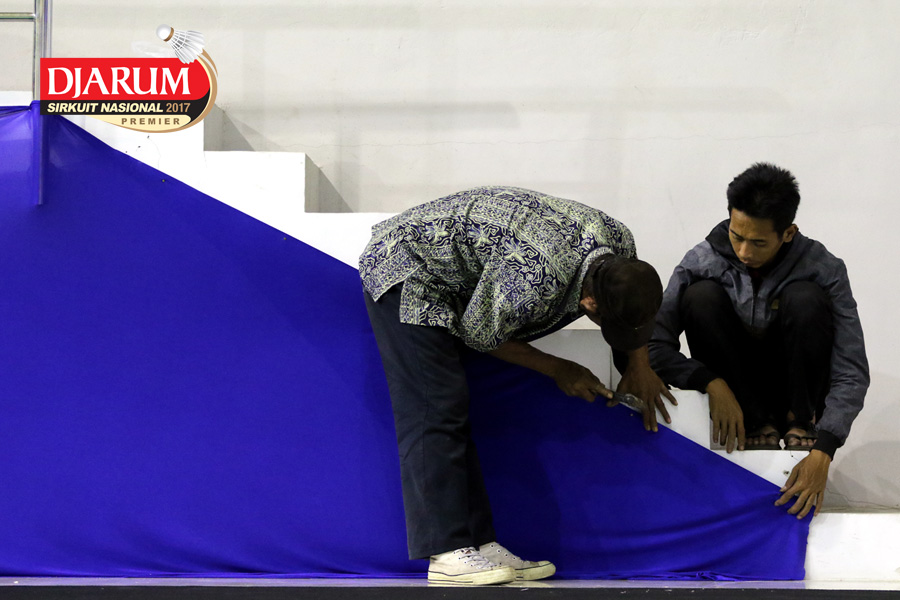 Dua Pekerja Saat Mempersiapkan Atribut Djarum Sirkuit Nasional Li-ning Premier Jawa Barat Open 2017
