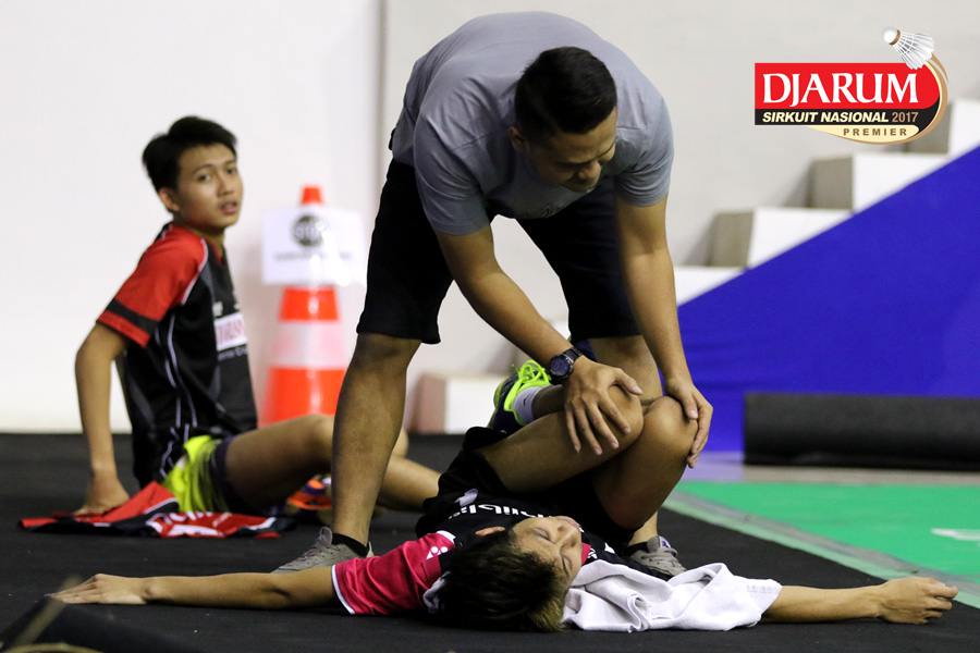 Wisnu Yuli (Djarum Kudus) Dibantu Fisiotrapis Melakukan Peregangan Usai Berlatih