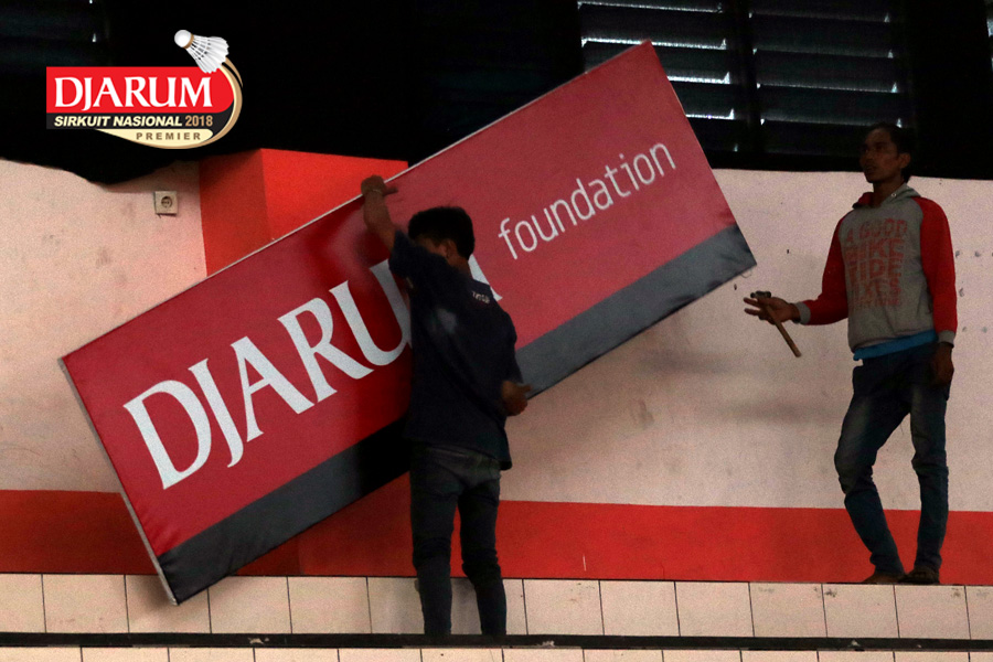 Dua Orang Pekerja Sedang Mempersiapkan Perangkat Logistik Djarum Sirkuit Nasional Premier Li-Ning Jawa Tengah Open 2018