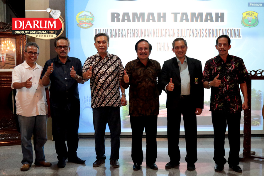 Plt Bupati Banyumas, Budhi Setiawan (Ketiga Dari Kanan) Berfoto Bersama Ketua Umum Pengprov PBSI Jawa Tengah, Andy Krisda Susila (Kedua Dari Kanan) Dan Para Panitia Djarum Sirkuit Nasional Premier Li-Ning Jawa Tengah Open 2018