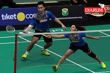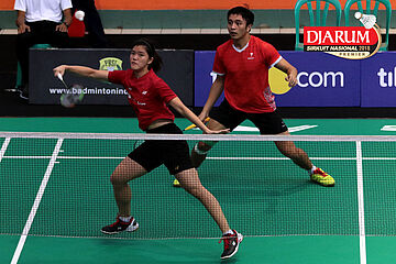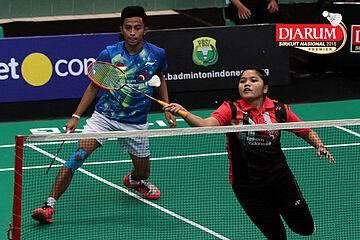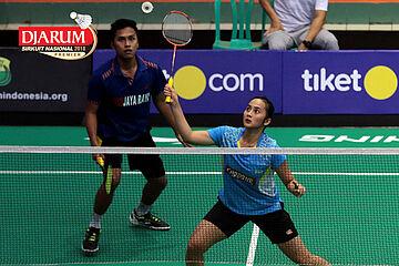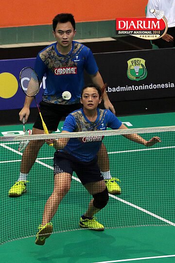 Zachariah Josiahno/Serena Kani (Tangkas Intiland/PB Djarum Kudus) Mengembalikan Shuttlecock