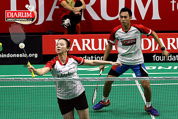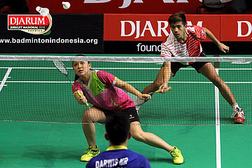 Lukhi Apri/Ririn Amelia (Djarum Kudus) Mengembalikan Shuttlecock.
