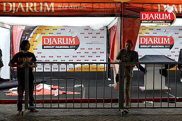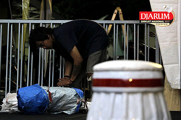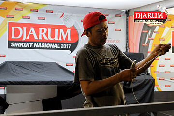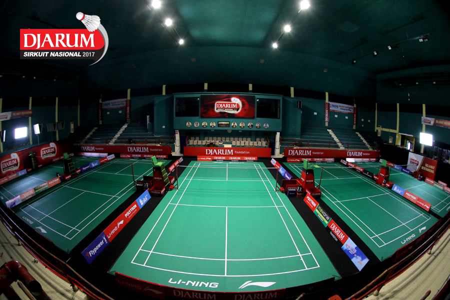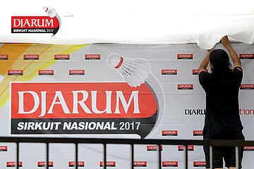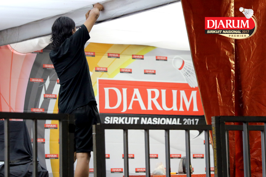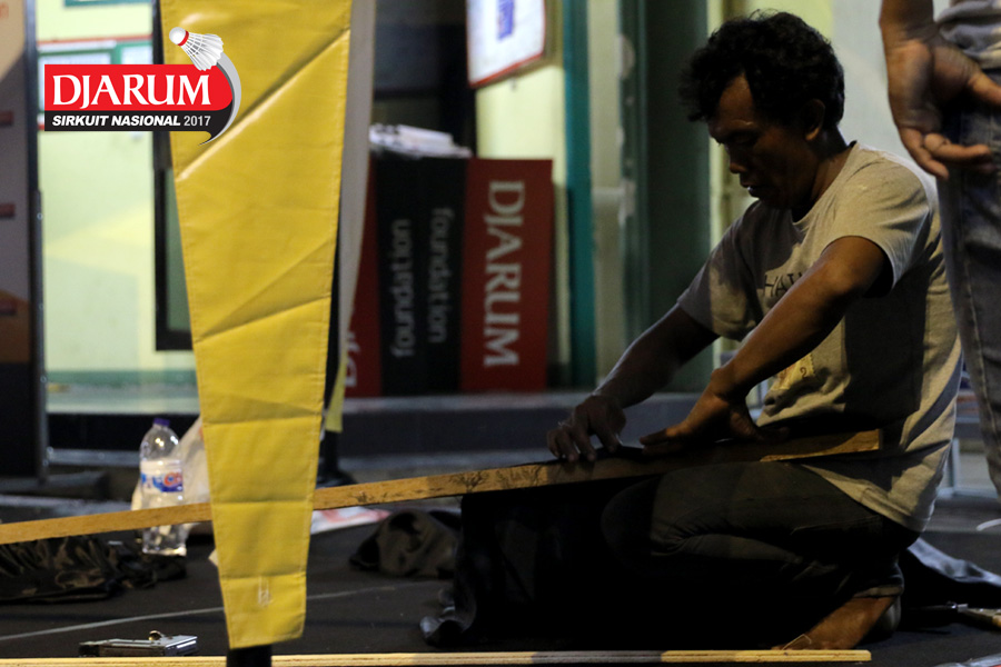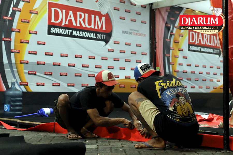 Dua Orang Pekerja Sedang Mempersiapkan Perangkat Logistik Djarum Sirkuit Nasional Premier Li-Ning Jawa Timur Open 2017