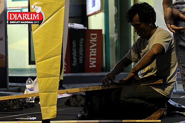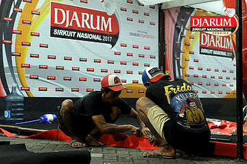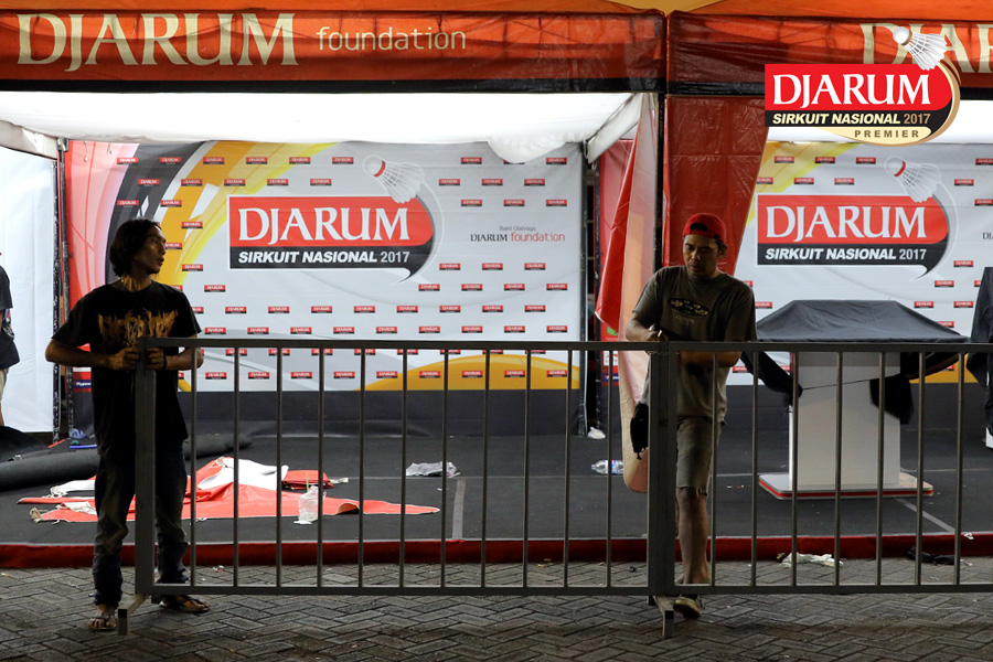 Dua Orang Pekerja Sedang Mempersiapkan Booth Tenant Djarum Sirkuit Nasional Premier Li-Ning Jawa Timur Open 2017