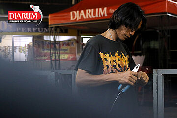 Seorang Pekerja Sedang Mempersiapkan Perangkat Games Di Booth Merchandise Djarum Sirkuit Nasional Premier Li-Ning Jawa Timur Open 2017