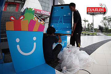 Dua Orang Pekerja Sedang Memasang Perangkat Logistik Di Booth Blibli.com