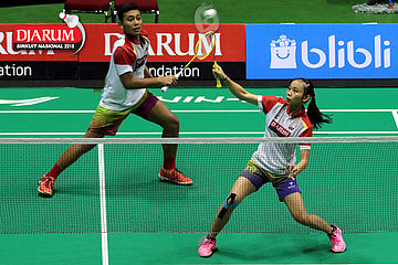Irfan Fadhillah/Pia Zebadiah Bernadet (Jaya Raya Jakarta) Mengembalikan Shuttlecock