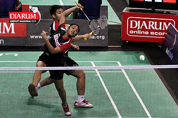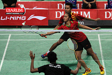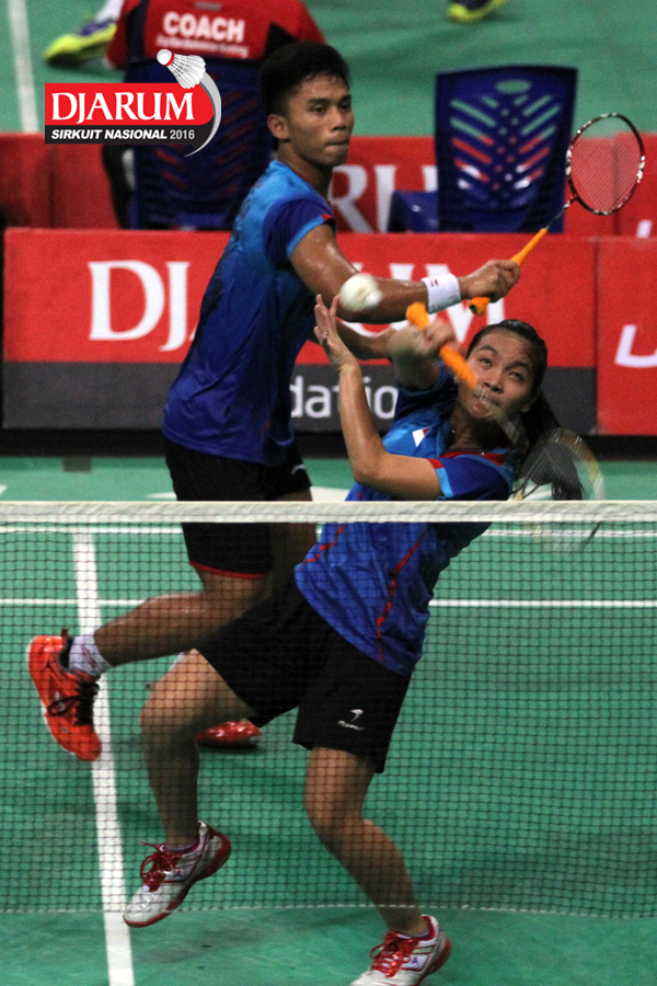Amri Syahnawi/Marissa Vania (SKO Ragunan/Tangkas) menyambar pengembalian tanggung