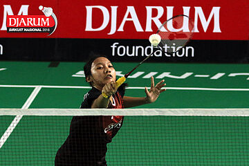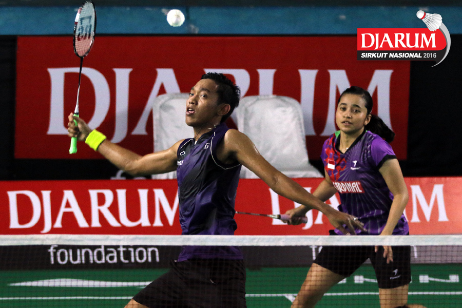 Akbar Bintang/Della Augustia (Djarum Kudus) mengembalikan shuttlecock.