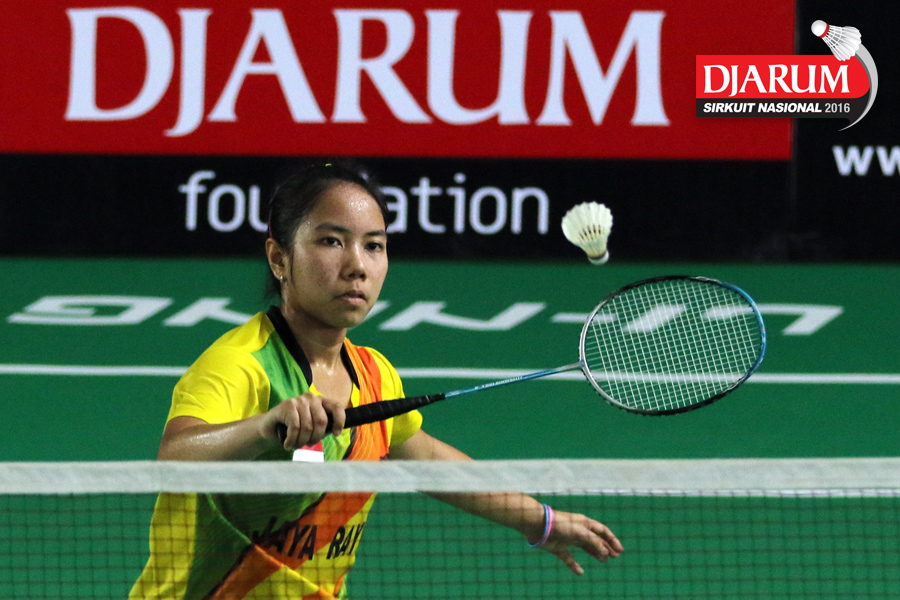 Agripina Prima Rahmanto/Anneke Feinya (Jaya Raya) mengembalikan shuttlecock.