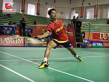 Pemain PB Jaya Raya Surya Naga, Fauzi Adnan terjatuh saat berusaha mengembalikan kok ke arah pemain SGS PLN Bandung, Yohannes Hendri Apriliyanto dalam babak perempat final tunggal dewasa putra Djarum Sirkuit Nasional Bali di GOR Purna Krida, Badung.