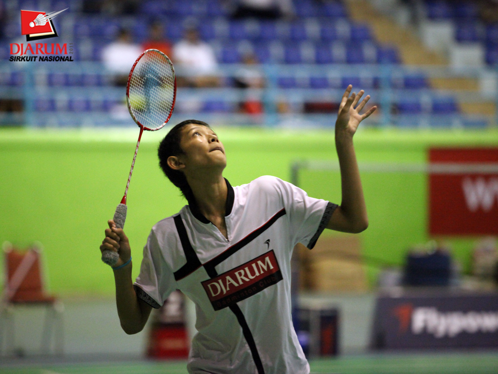 Yoga Sidik (Pelatprov DKI Jakarta) berusaha memukul kok ke arah lawan di babak penyisihan Tunggal Remaja Putra Djarum Sirkuit Nasional (Sirnas) Pangkalpinang