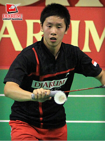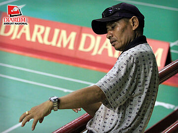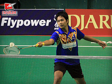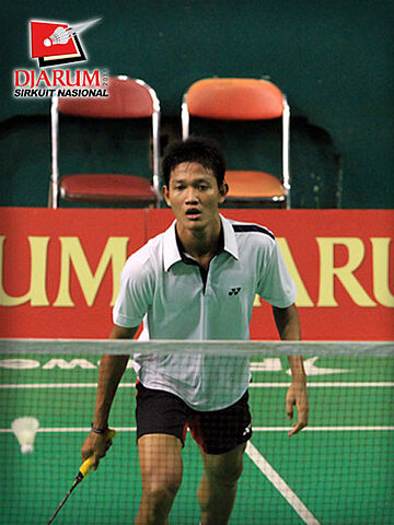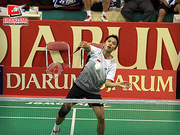 Pemain Pertamina, Alamsyah Yunus berusaha mengembalikan kok ke arah pemain Surya Baja, Hadi Husein dalam babak penyisihan tunggal dewasa putra Djarum Sirkuit