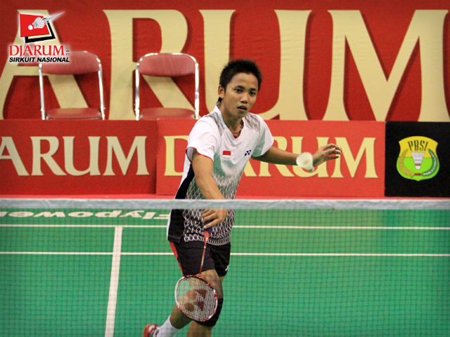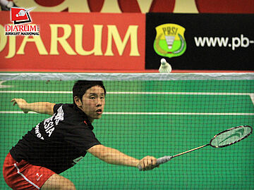Pemain Pelatnas Panji Akbar Sudrajat mengembalikan kok ke arah pemain MBK, Josua dalam babak penyisihan tunggal dewasa putra Djarum Sirkuit Nasional Surabaya di GOR
