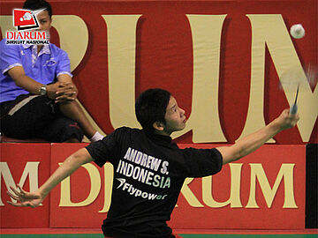 Pemain PB Djarum, Andrew Susanto berusaha mengembalikan kok ke arah pemain BBC, M. C Hidayatullah dalam babak penyisihan tunggal remaja putra Djarum Sirkuit Nasional Surabaya di GOR Sudirman, Surabaya, Senin (31/10).