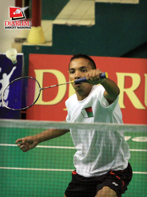 Pemain Madagaskar Haja Vanj Inirina Mare Alberto mengembalikan kok ke arah pemain Djarum Kudus, Gary dalam babak penyisihan tunggal dewasa putra Djarum Sirkuit