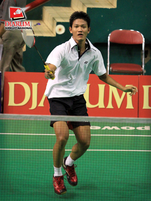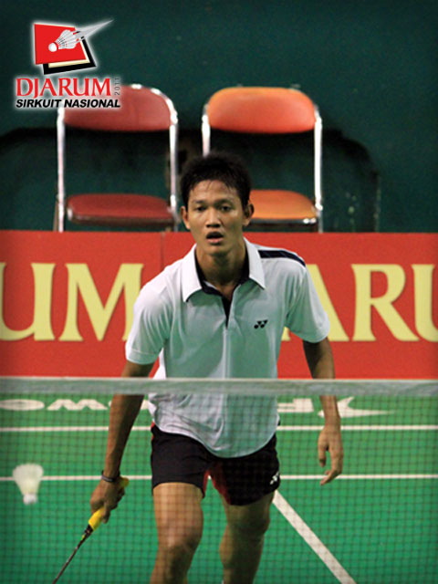 Pemain Bank Sumsel BABEL, Achmad Rivai mengembalikan kok ke arah pemain Pelatprov DKI Jakarta, Christofel Brians dalam babak penyisihan tunggal dewasa putra Djarum Sirkuit Nasional Surabaya di GOR Sudirman, SBY, Senin (31/10).